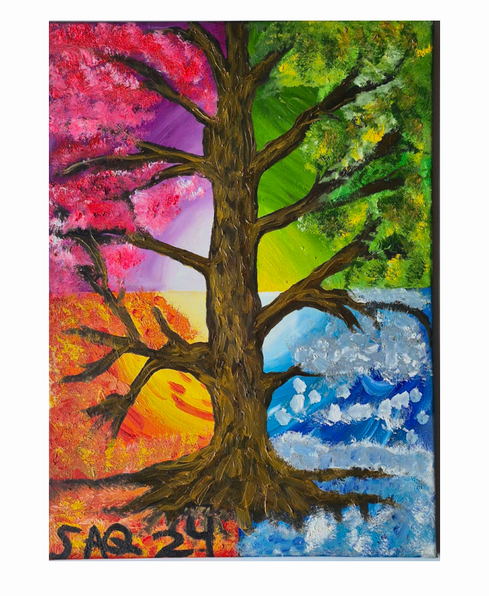 Es una obra de arte al óleo sobre lienzo, de 61×51 cm y con marco 71×61 cm, que representa la majestuosidad de un árbol simbolizando las cuatro estaciones. Sus vibrantes secciones de color reflejan la transición de la naturaleza, desde la floración primaveral hasta el invierno nevado, todo en una sola composición dinámica.