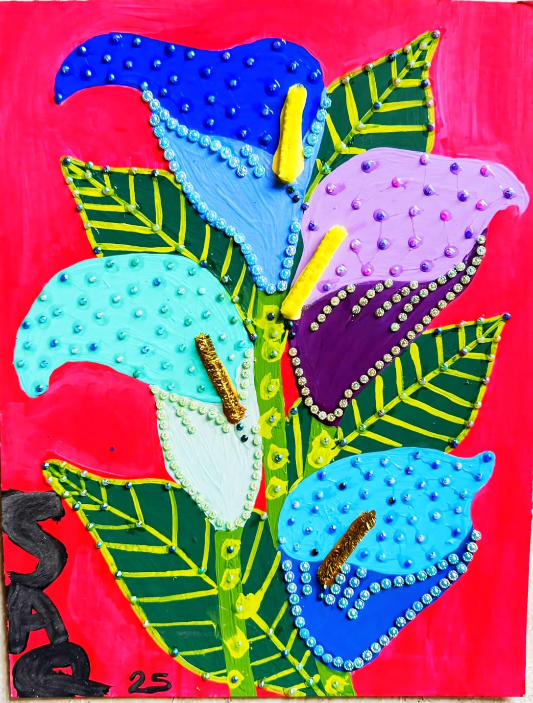 La obra destaca por su técnica mixta y relieve. El uso de acrílicos en tonos azules, violetas y turquesas se complementa con una aplicación detallada de pedrería y cuentas brillantes, que bordean los pétalos y recorren los tallos. Este detalle no solo añade un brillo elegante, sino que le otorga a la pieza una cualidad táctil y tridimensional que cambia según la incidencia de la luz.