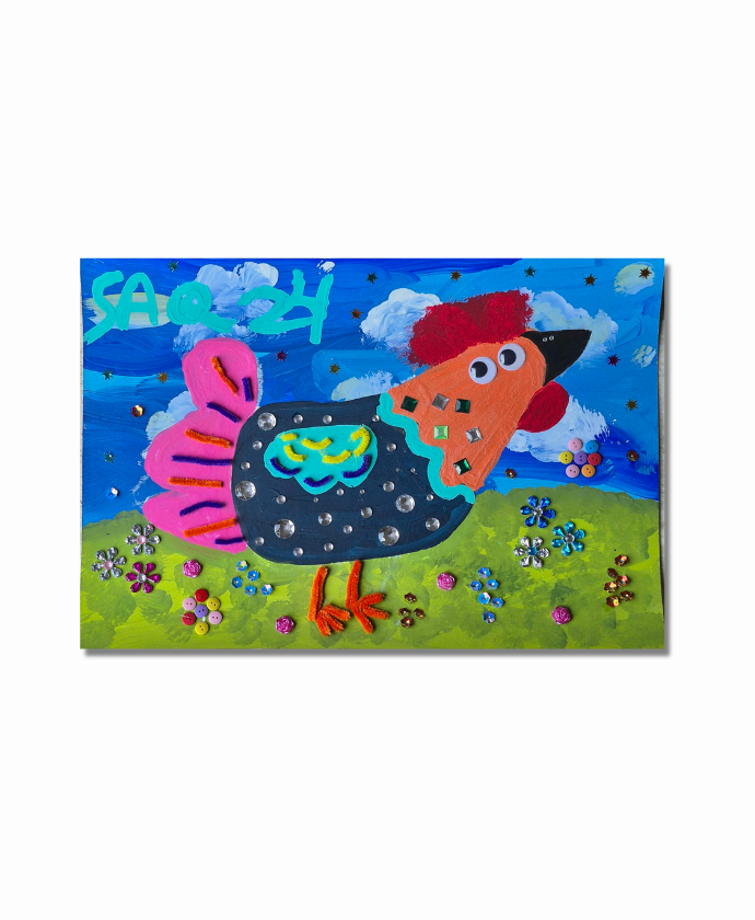 El Gallo Multicolor es una encantadora pieza de 35×25 centímetros, elaborada con pintura de acrílico sobre cartón paja y enriquecida con la adición de pedrería brillante que le confiere un toque mágico y lúdico. La obra centraliza un gallo con un diseño vibrante y contemporáneo, cuyo cuerpo negro se adorna con un patrón de pedrería que simula burbujas y destellos, añadiendo una textura fascinante y un juego de luces. Las alas en un rosa intenso, la cola en naranja y el pico en una combinación de naranja y negro, junto con la cresta roja, le otorgan al gallo una personalidad distintiva y llena de alegría. Los grandes ojos, también adornados, le confieren una expresión de curiosidad y vivacidad.