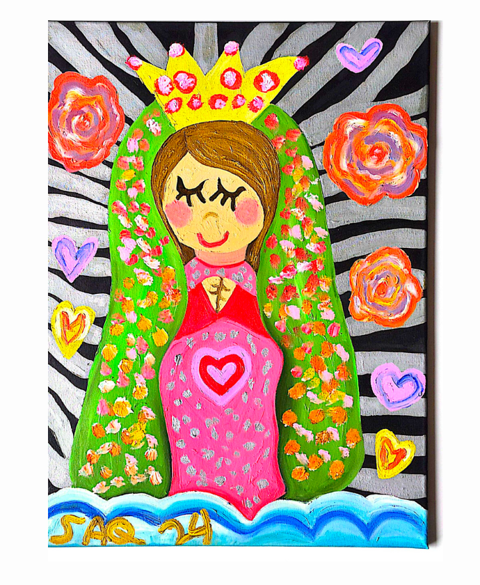 El fondo de rayas blancas y negras, reminiscentes de un patrón de cebra, crea un contraste moderno y audaz con la figura tradicional, dotando a la pieza de una dualidad interesante entre lo clásico y lo contemporáneo. Alrededor de la figura, pequeños corazones flotan en diferentes tonos de rosa, morado y amarillo, reforzando el simbolismo del amor y la protección. La parte inferior del cuadro presenta una base de olas azules, sugiriendo un ancla o un renacimiento. La técnica del óleo permite una aplicación rica y textura de la pintura, dando vida a cada detalle.