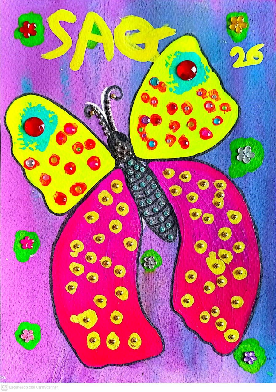 Técnica: Acrílico sobre cartón, piedras y flores. Una mariposa de alas vibrantes en amarillo neón y magenta intenso despliega su belleza sobre un fondo degradado en lila y azul. Sus alas están adornadas con piedras de colores y puntos dorados que le aportan brillo y textura, mientras pequeñas flores decoran el entorno. Una obra fresca, femenina y llena de vida.