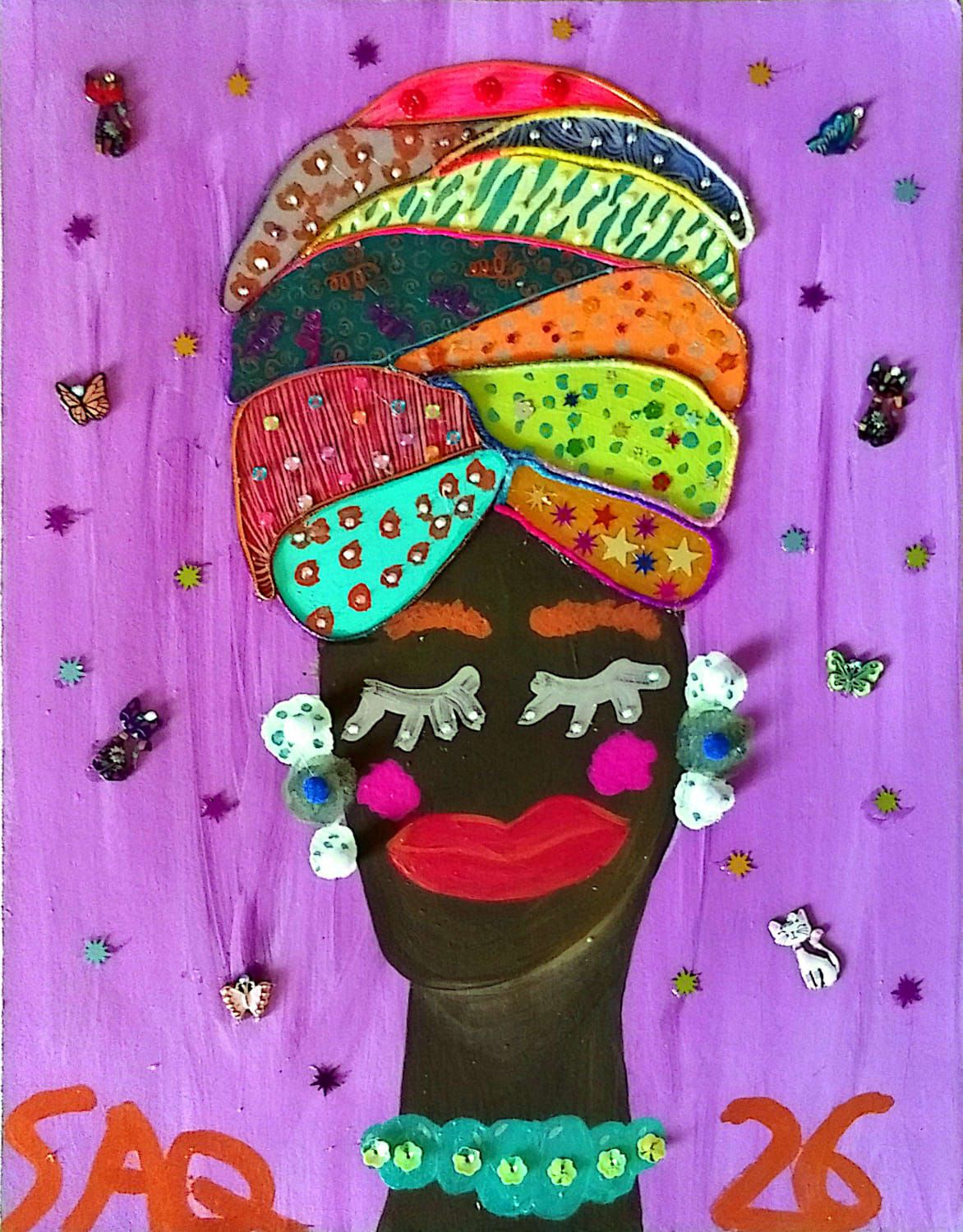 Negra con turbante es una pieza artística fascinante que fusiona el color audaz con una experiencia táctil excepcional. Con medidas 45 x 35 cm. Esta obra rinde homenaje a la estética afrodescendiente a través de una representación moderna y llena de fantasía. Elaborada meticulosamente sobre cartón paja, la pieza utiliza una base de acrílico para dar profundidad a los rasgos y al fondo, mientras que una variedad de materiales añadidos le otorgan una personalidad única.