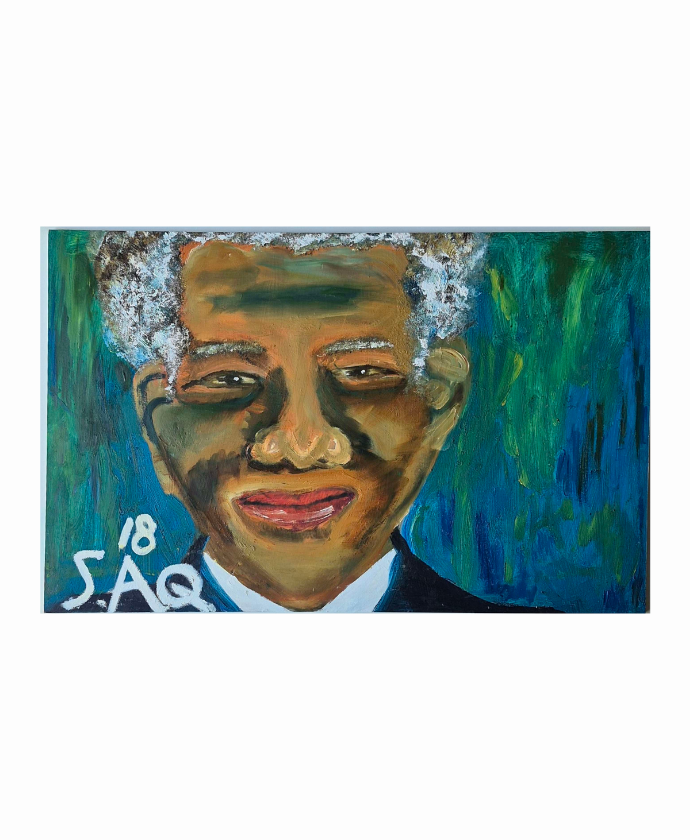Esta pieza única de arte, es una poderosa y vibrante obra al óleo sobre lienzo. El retrato de Nelson Mandela cobra vida a través de una paleta de colores audaz y un estilo pictórico expresivo que resalta su carácter y su profunda humanidad. El artista ha utilizado tonos azules y verdes intensos en el fondo para crear un contraste dramático que acentúa la calidez y la sabiduría de la figura central. Con un lienzo que mide 80×50 cm, con marco de 90×60 cm, este cuadro es una pieza central que no pasará desapercibida en cualquier espacio.