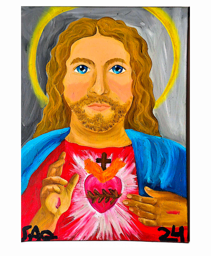 Descripción Sagrado Corazón de Jesús es una obra de arte profundamente emotiva y visualmente impactante, creada con la técnica de pintura al óleo sobre lienzo. Con unas dimensiones de 61×51 centímetros y con marco 71×61 centímetros, la pieza tiene una presencia considerable que invita a la contemplación. La obra presenta una figura sacra central, con el rostro enmarcado por cabellos largos y ondulados, y una mirada de ojos azules, penetrante y serena. Un halo dorado brillante irradia desde detrás de su cabeza, simbolizando su divinidad y luz. La figura viste una túnica roja y un manto azul, colores tradicionalmente asociados con estas representaciones, aplicados con una pincelada expresiva que añade textura y profundidad.