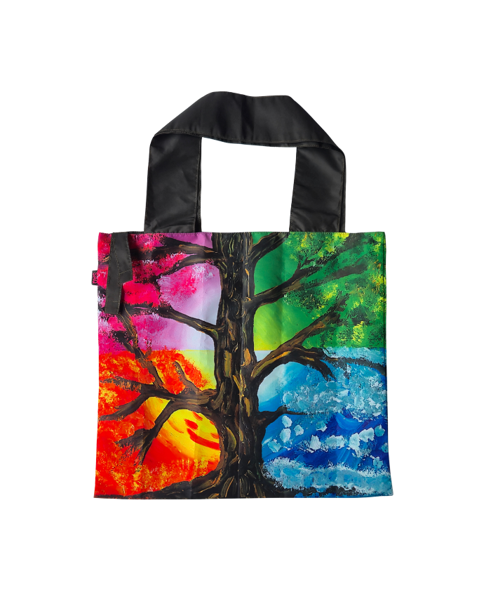 Expresa tu conexión con el arte y el ritmo de la naturaleza con nuestro Tote Bag de Arte Plegable “Árbol de las Estaciones”. Este práctico y elegante bolso presenta una vibrante reproducción de nuestro cuadro original, que captura la belleza única de cada estación en un solo árbol majestuoso. Los colores vivos del florecer primaveral, la frondosidad del verano, los tonos cálidos del otoño y la serenidad del invierno se fusionan en un diseño lleno de significado. Con unas generosas medidas de 45×42 cm, ofrece espacio suficiente para tus compras, libros, artículos de playa o cualquier esencial del día a día. Además, su diseño inteligente permite plegarlo fácilmente hasta un tamaño compacto de 10×10 cm, ideal para guardarlo en tu bolso o bolsillo cuando no lo necesites, convirtiéndolo en un compañero ecológico y siempre listo para usar.