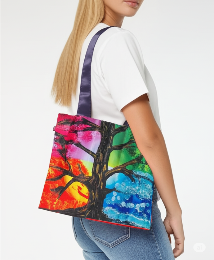 Fabricado en material antifluidos de alta calidad, este tote bag es resistente, de fácil secado y muy sencillo de lavar, asegurando su durabilidad y manteniendo la viveza de su estampado por mucho tiempo. Las asas robustas garantizan un transporte cómodo y seguro. Ya sea para ir de compras, a la universidad, al gimnasio o simplemente para añadir un toque artístico y natural a tu estilo, el Tote Bag “Árbol de las Estaciones” es la combinación perfecta de funcionalidad, sostenibilidad y amor por el arte. ¡Lleva la belleza del ciclo de la vida a donde quiera que vayas!