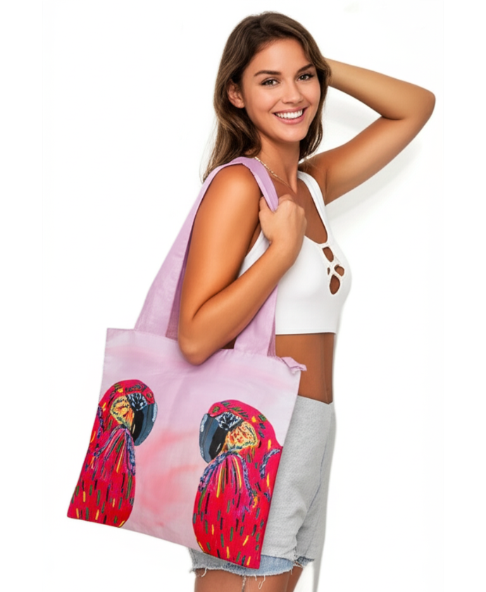 Fabricado en material antifluidos de alta calidad, este tote bag es resistente, de fácil secado y muy sencillo de lavar, asegurando su durabilidad y manteniendo la viveza de su estampado por mucho tiempo. Las asas robustas garantizan un transporte cómodo y seguro. Ya sea para ir de compras, a la universidad, al gimnasio o simplemente para añadir un toque artístico y exótico a tu estilo, el Tote Bag “Loro Tropical” es la combinación perfecta de funcionalidad, sostenibilidad y amor por el arte.
