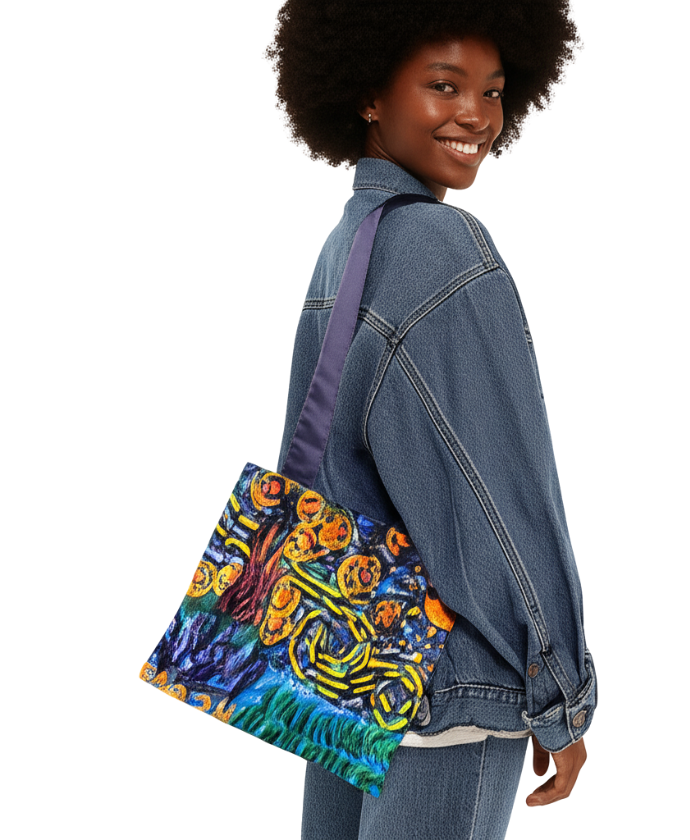Fabricado en material antifluidos de alta calidad, este tote bag es resistente, de fácil secado y muy sencillo de lavar, asegurando su durabilidad y manteniendo la viveza de su estampado por mucho tiempo. Las asas robustas garantizan un transporte cómodo y seguro. Ya sea para ir de compras, a la universidad, al gimnasio o simplemente para añadir un toque artístico a tu estilo, el Tote Bag “Noche Estrellada” es la combinación perfecta de funcionalidad, sostenibilidad y amor por el arte. ¡Lleva la belleza de la noche estrellada a donde quiera que vayas!
