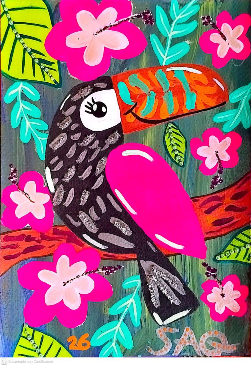 El entorno que rodea al tucán es igualmente festivo: flores en rosa intenso y rosa pálido se distribuyen por todo el lienzo, acompañadas de ramas y hojas en turquesa y verde limón que crean un fondo selvático lleno de movimiento.
