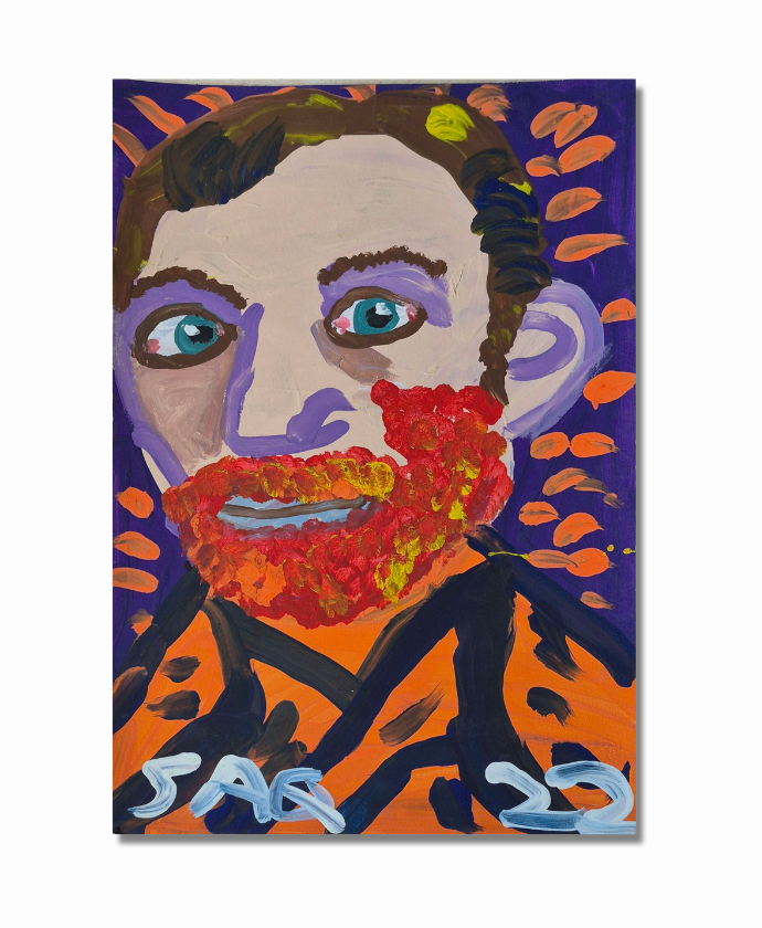 Vincent Van Gohg es una cautivadora pieza realizada con pintura de acrílico sobre cartón paja, midiendo 35×25 centímetros, que se distingue por su explosión de color y su representación enérgica de una figura masculina. La técnica de acrílico permite una saturación de pigmento que realza la intensidad de la barba, pintada en tonos rojos y anaranjados, contrastando audazmente con la tez pálida del sujeto y sus ojos de un vibrante azul verdoso. La mirada penetrante del hombre parece invitar al espectador a una introspección, mientras que el fondo púrpura salpicado de formas naranjas añade una dimensión casi onírica a la composición, sugiriendo un aura de misterio y calidez.