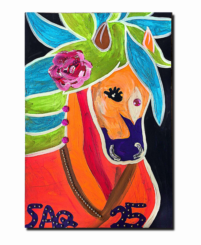 Una vibrante yegua llena de color, textura y carácter. Pintado en acrílicos sobre cartón paja de 35×25 cm, con detalles en pedrería brillante que resaltan su espíritu festivo y elegante.